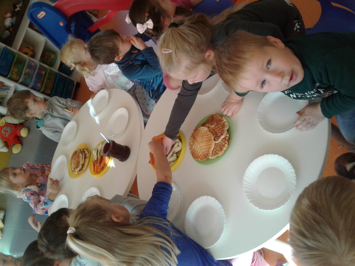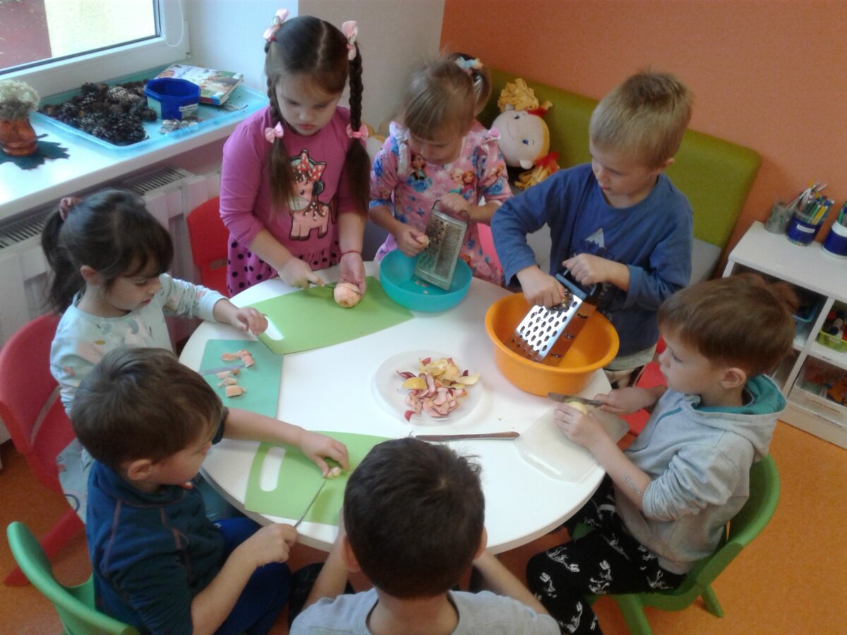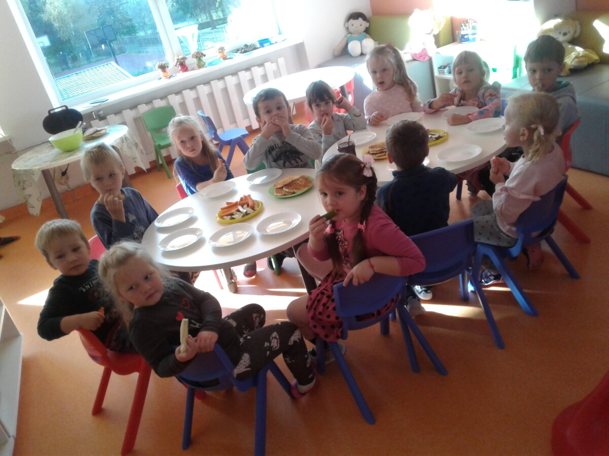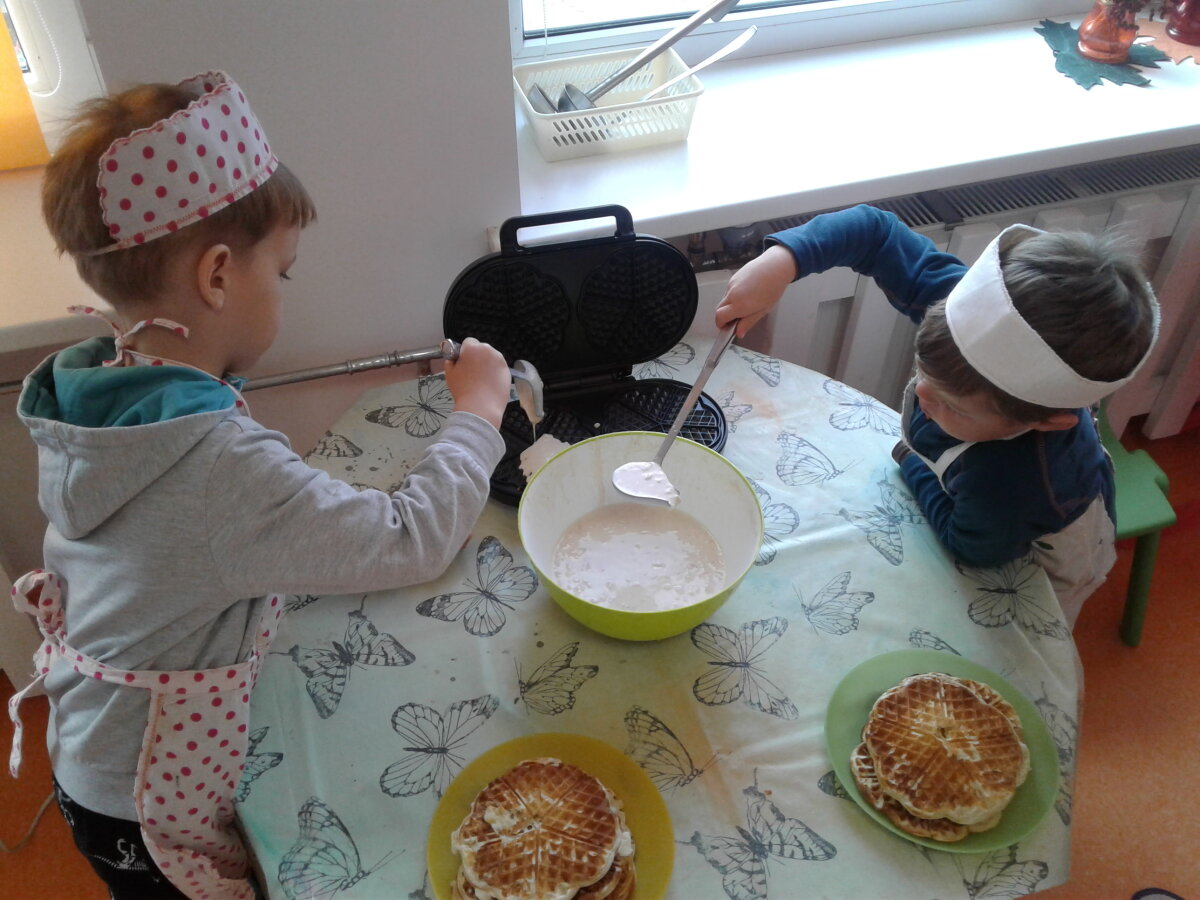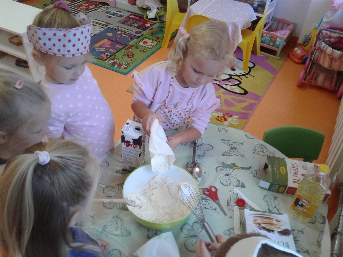 Mėgstame gaminti patys. Todėl sutartinai kibome į darbus: plovėme, pjaustėme ir tarkavome obuolius, maišėme blynams tešlą, patys pylėme tešlą į keptuvę ir patys atsargiai, kad neapsidegintume, ištraukėme blyną iš jos. Mokytoja atnešė naminės aviečių uogienės - valgėme net pirštelius aplaižydami, nes labai skanu buvo. Žinoma, bevalgydami pasikalbėjome ir apie tai, kaip svarbu nepersivalgyti, maistą tausoti, su stokojančiu pasidalinti.