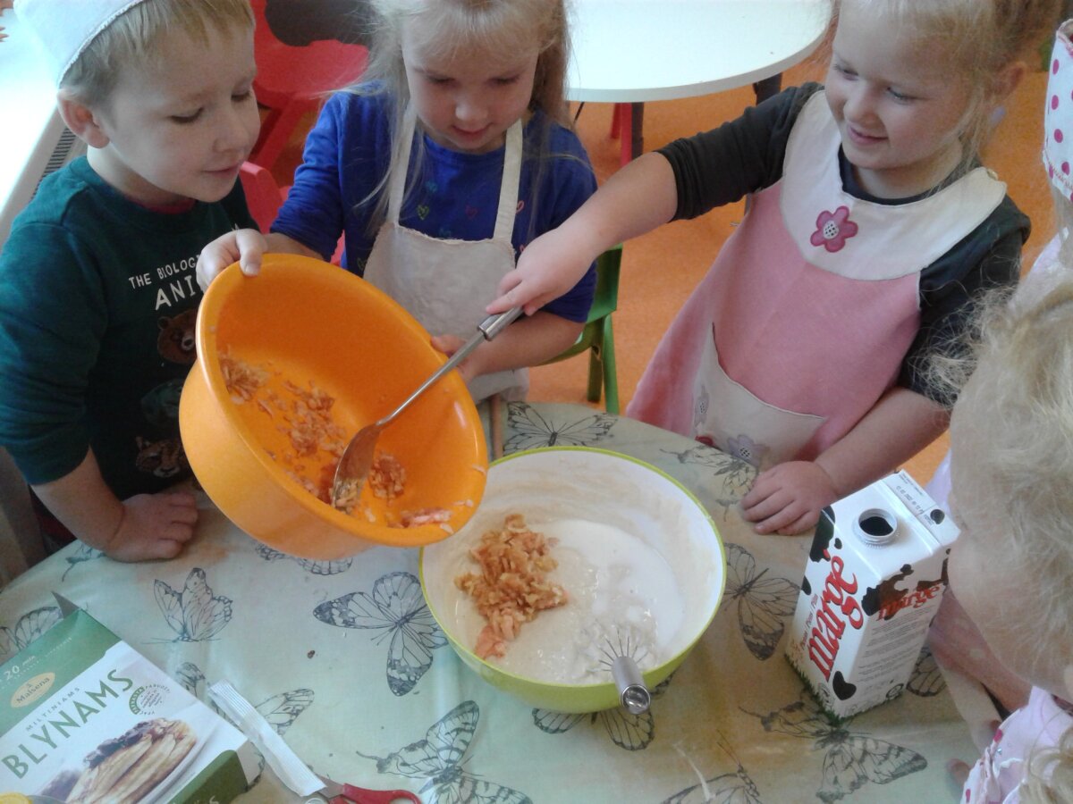 Mes, 1-os ikimokyklinės grupės vaikai, mėgstame valgyti daug ką, bet blynus mėgstame labiausiai... Todėl, prisijungę prie tarptautinio Etwinning projekto "Kultūrinis kaleidoskopas" ir sužinoję, kad spalio 16-oji yra Tarptautinė maisto diena bei gavę užduotį pagaminti vieną patiekalą bendrai dalyvių kuriamai elektroninei receptų knygelei, vienbalsiai nusprendėme iškepti blynų, bet širdelės formos ir su obuoliais!