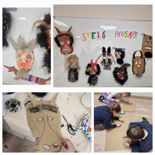Ilgakiemio mokyklos-darželio 3 klasės mokiniai, taikydami STEAM metodiką, gamino tradicines Užgavėnių kaukes, naudodami įvairias medžiagas: kartoną, pakulas, virvutes, siūlus, medines ir plastikines detales, kailį. Pamokos pradžioje susipažinome su Užgavėnių kaukių tradicijomis bei užduotimi: sukurti unikalią, patvarią, meniškai išraiškingą kaukę, atitinkančią Užgavėnių tematiką.