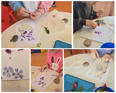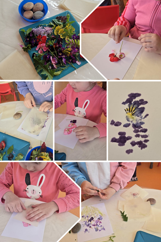 I PU grupės vaikai tyrinėjo įvairias gamtoje rastas gėles, žoleles. Kalbėjo ir pasakojo, kaip jų spalvos gali būti perkeltos ant popieriaus, naudojant akmenukus išspausti. Tokiu būdu vaikai tyrinėjo augalų struktūrą, spalvas, stebėjo, kaip išsiskiria natūralios spalvos.