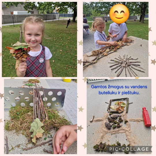 Veiklos metu gimė originalūs gamtos kūriniai: iš šakelių ir akmenukų sudėtas lizdas, iš žolių ir pagaliukų pastatyta palapinė, smėliu ir akmenukais atkurtas pajūris, iš šakelių suformuotas paukščio lizdas, spalvingais lapais papuoštas gamtos medis ir net linksmas gamtos žmogeliukas.