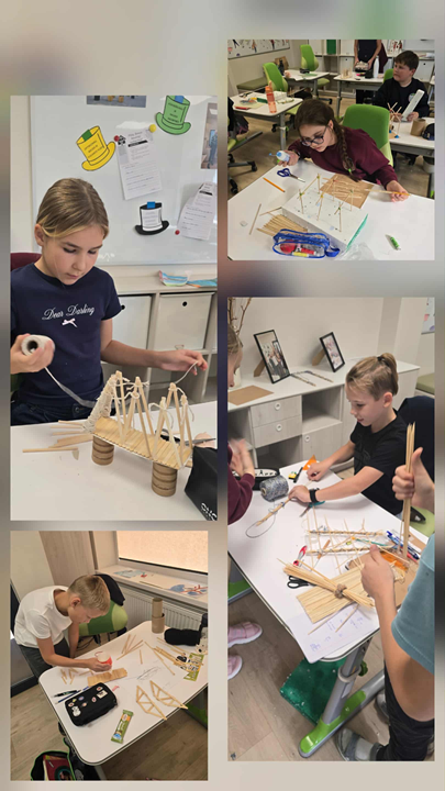 Technologijos: darbas su įvairiomis priemonėmis (klijais, siūlais, gumelėmis, pagaliukais, kartonu). Mokiniai mokėsi pasirinkti tinkamiausią technologinį sprendimą, kad tiltas laikytųsi.