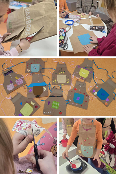 PU grupės vaikai veiklos metu aptarė, kam reikalinga prijuostė, kaip ji padeda palaikyti švarą ir tvarką. Iš popierinių pirkinių maišelių kūrė savo įsivaizduojamą prijuostę. Kirpo jos formą, matavo, kūrė dizainą: piešė, klijavo, puošė įvairiomis detalėmis. Kiekvienas sukūrė savo unikalią prijuostę, kurią panaudojo vaidybiniame žaidime.